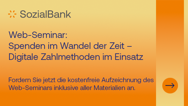 Die Erwartungen an einfache, bargeldlose Prozesse steigen – insbesondere durch den Wandel in der Spenderstruktur. In unserem Webinar im Rahmen der Reihe „StrategieImpulse“ zeigten wir, wie sich diese Entwicklungen auf die Spendenprozesse auswirken und welche Chancen sich durch digitale Zahlungsmethoden für Ihre Organisation ergeben. Sehen Sie sich jetzt die Aufzeichnung an.